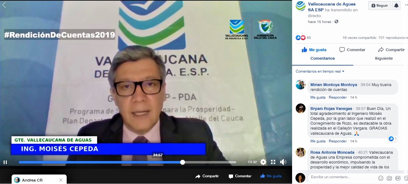 Dando cumplimiento a las normatividades legales vigentes contempladas para la realización de las Audiencias Públicas de Rendición de Cuentas y la actual situación presentada en el País, frente al Covid 19; la Empresa Gestora del Plan Departamental de Aguas del Valle del Cauca, dio a conocer las acciones desarrolladas durante la vigencia 2019 en el sector de agua potable y saneamiento básico, donde se evidencio una ejecución del 93% representada una inversión total de $38.346millones.
